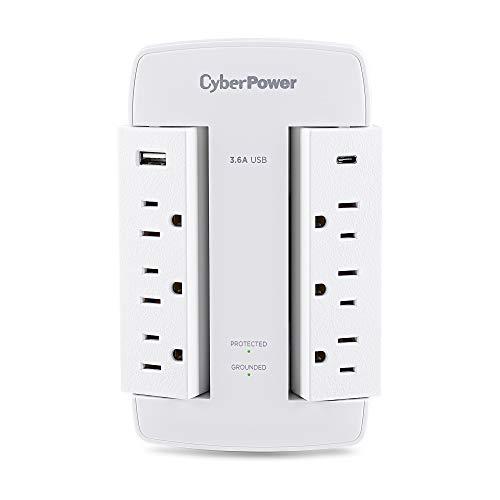 The CyberPower CSP600WSURC5 is ideal for Home/Office protection with 900 joules, 6 swivel outlets, 2 USB charge ports (3.6 Amps shared), and a convenient wall tap design. The CSP600WSURC5 has outlets that swivel 90 degrees left or right to make it easy to manage, organize, and assure cords are low profile - great for tight plug-in locations. As a surge protector, the CSP600WSURC5 prevents damage to computers, phones, printers, and other electronics by diverting excess voltage during a power spike. Plus, its all backed by a 1 Year Limited Warranty and a $75,000 Connected Equipment Guarantee.
