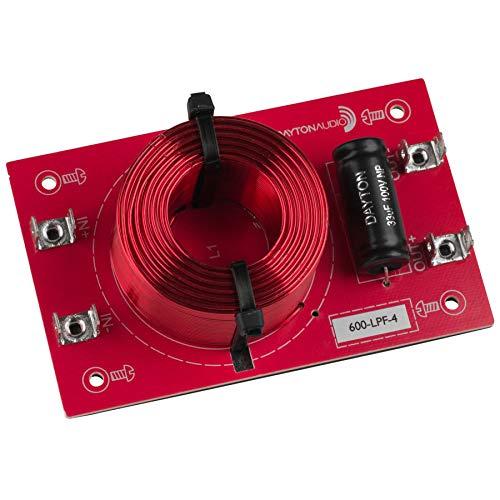 Quick OverviewThis 2nd order (i.e. 12 dB per octave) low pass Linkwitz-Riley filter from Dayton Audio passes frequencies below 600 Hz and can easily be combined with other filters in this series to create 2-way or even 3-way crossover networks. Designed for use with 4 ohm drivers. Product Highlights High quality air core inductors in series with the driver High quality components are securely fastened to PCB Frequencies can be staggered or overlapped for desired response High quality red PC board with EVA backing to prevent shorts and vibration Dual 0.205" terminals at each connection point for easy parallel wiring Product Manuals / Spec Sheets / Downloads AddThis Sharing Buttons Share to FacebookFacebook Share to TwitterTwitter Share to MoreAddThis Product Description Dayton Audios premium inline passive filters make it easy to limit a drivers frequency response to a specific desired bandwidth. By using combinations of these filters you can create complete 2-way or 3-way crossovers. The components used in each of these are the same high quality you have come to expect from Dayton Audio. This 12dB/octave 600 Hz low pass filter can be combined with our 600 Hz high pass for a 2nd order Linkwitz-Riley crossover, which sums for flat transfer function across the crossover frequency. In addition, you can stagger or overlap filter frequencies to overcome peaks and dips in individual drivers frequency response to create crossovers that acoustically sum flat across the crossover point. Specifications: Type: Low Pass Filter Frequency: 600 Hz Impedance: 4 ohms Dimensions: 105 mm x 65 mm Power handling: 250 watts Series inductor value: 2.1 mH Parallel capacitor value: 33 F Product Details Model Number 600-LPF-4 List Price $22.99 Unit of Measure Each UPC 848791004100 Warranty - Parts 5 Years Warranty - Labor 5 Years Product Shipping Weight (lbs.) 0.9 Product Weight -- Product Height -- Product Width -- Product Length -- Product Depth --