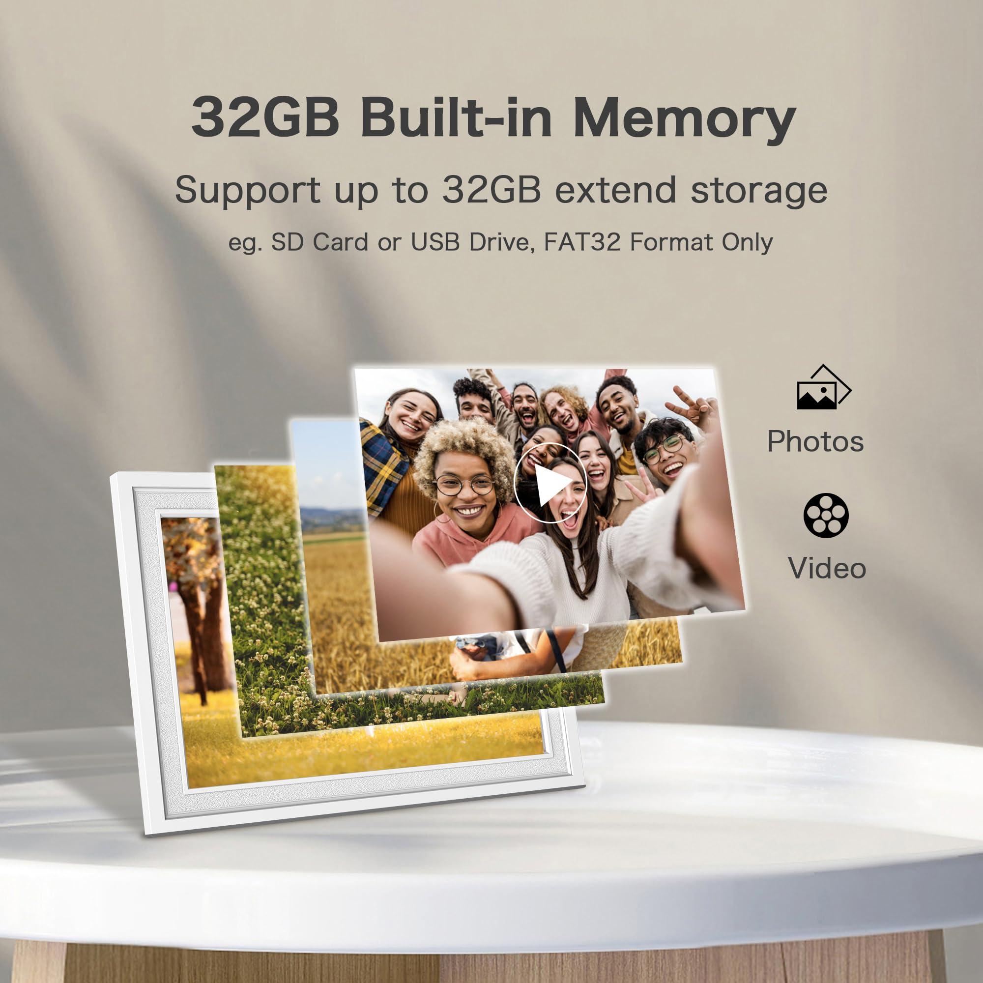 - Instant Share via Frameo APP; Connect your frame to WIFI, and share photos and videos(Max.15s) quickly via a reliable App - Frameo to our electronic photo frame from anywhere, privately and safely, no member numbers limited. For those who already have a Frameo digital frame, no need to download another app. It has 32GB built-in memory and support up to 32GB external storage, enables you to share 50,000+ photos. Also, you can transfer via external storage or through a computer, no Wi-Fi needed