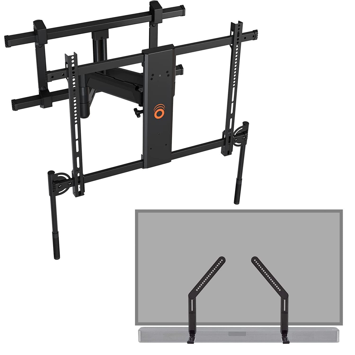 ECHOGEAR XL Large Full Motion TV Mount kit tilts, swivels and extends to give you the best viewing angle without having to touch your screen thanks to the included handles! Pair with our on-wall soundbar mount to enhance your setup, allowing the sound to move with your screen as you adjust the TV.