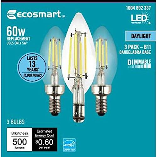 The 60-Watt Equivalent EcoSmart B11 candelabra base vintage filament LED light bulb is a stylish replacement for traditional incandescent bulbs - with all the benefits of LED technology. These LED light bulbs are dimmable, have a clear all-glass exterior, and provide an omni-directional (360) distribution of light. Save on your energy bill every month! The energy efficient EcoSmart 60-Watt equivalent decorative LED filament light bulb offers a 91% savings over traditional lighting by using only 5-Watts of energy. This bulb emits 5000K (Daylight) color temperature, which is essential for creating a bright, crisp feel throughout your home. It is recommended for living rooms, kitchens, bathrooms, and bedrooms. Customize your lighting style with this dimmable bulb by adjusting your light from daylight to a relaxing, low light. These EcoSmart LED light bulbs are Indoor/Outdoor (wet rated) and are able to be used in enclosed fixtures. They are also rated for 90 CRI (color rendering index). The 15,000-hour lifespan and 5-year warranty makes these light bulbs a great choice for applications in your home and office. Start saving today with EcoSmart.