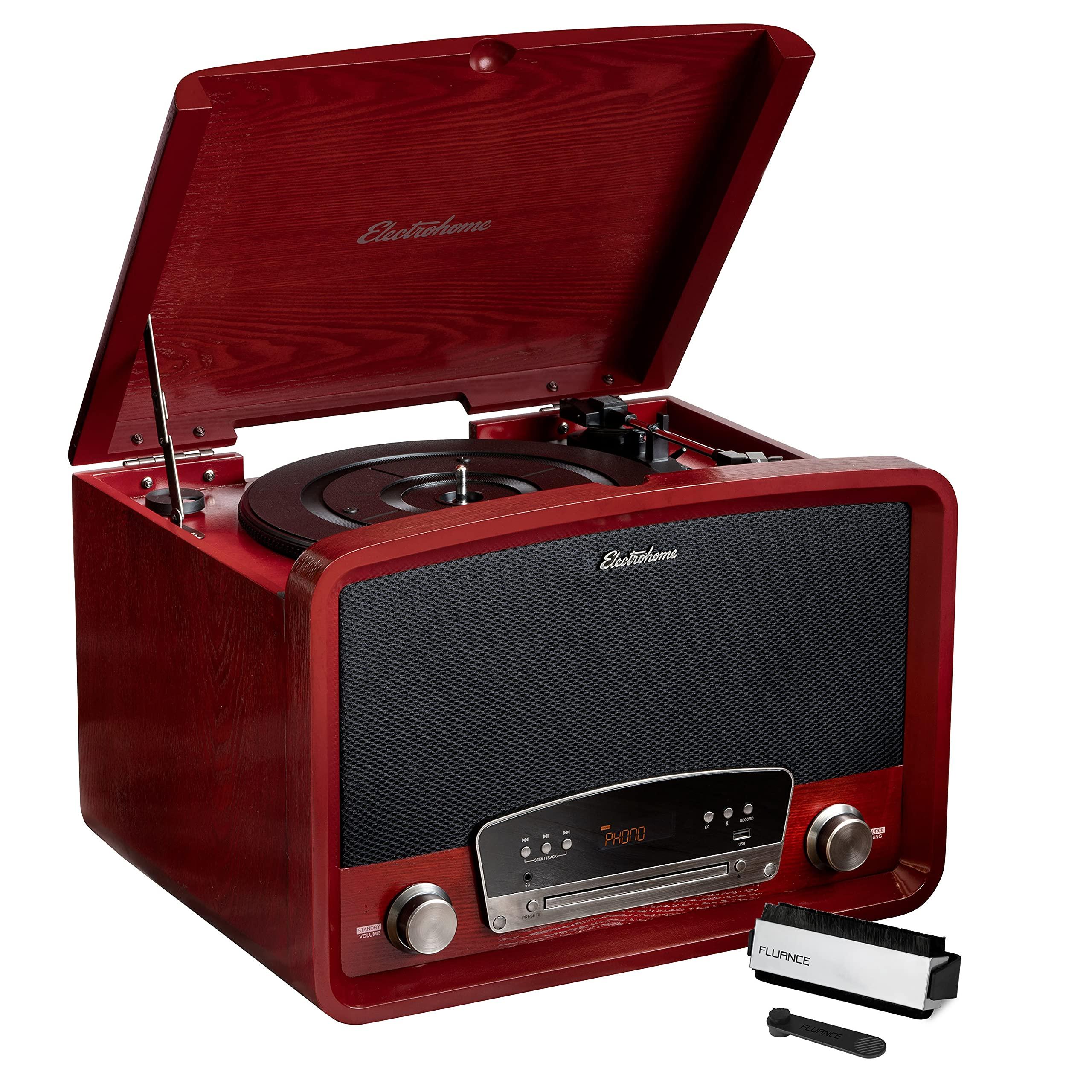 The ultimate expression of our passion for music backed by 100 years of designing home audio products, the Electrohome 7-in-1 Record Player Stereo System with Fluance Vinyl Record Cleaning Kit 2-in-1 Anti-Static Record & Stylus Brush is your gateway to your entire music collection. Marrying the retro charm of vintage vinyl record player consoles with the technology of today, the Kingston is the last music system you will ever need.