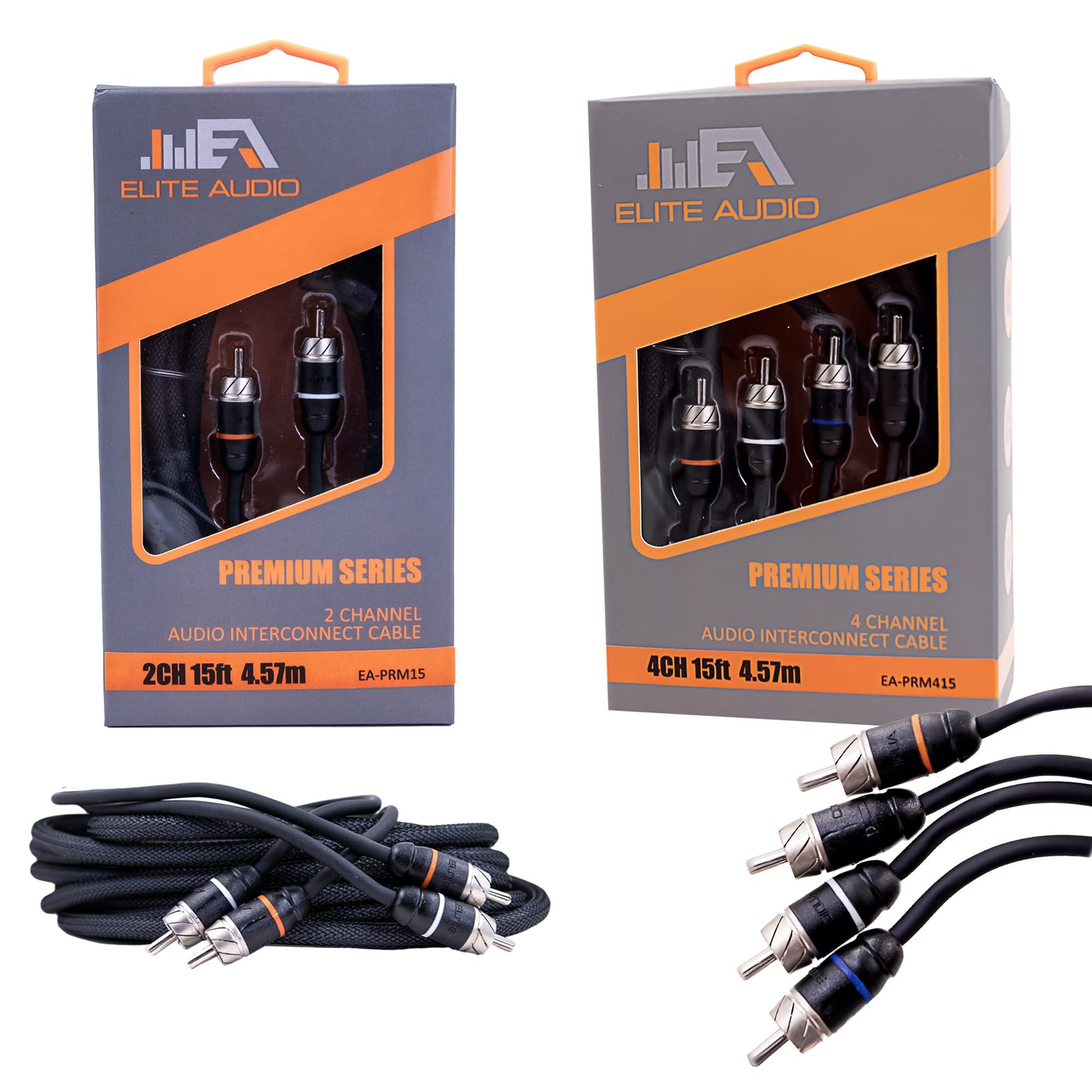 Elite Audio Subwoofer and Speaker Amp Premium Series RCA Cable Package: 1x 4-Channel 15 ft & 1x 2-Channel 15 ft RCA Cables for Car Audio Installation