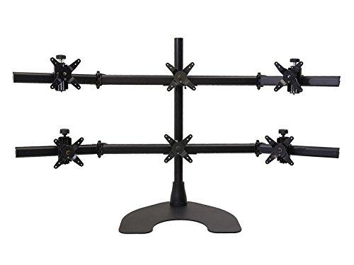Ergotech 100-D28-B33 mounts 6 LCD monitors on this heavy duty, portable desk stand. The Heavy Duty Hex (3 over 3) LCD Desk Stand is a dynamic mounting solution designed to display 6 larger LCD monitors in a 3 over 3 configuration. This powerful system offers enormous display capability and the flexibility of an easily transportable system. This desk stand provides durable and stable support for 6 monitors sized from 17 to 24. Place this flexible solution anywhere on the work surface and move it from one location to another with ease. Maximize desk space and eliminate paper clutter with this dynamic desk stand. Tool-less design ensures fast, easy installation of 6 LCD monitors. The Heavy Duty Hex (3 over 3) LCD Desk Stand is equipped with Ergotechs tool-less engineering which makes monitor installation a breeze. The quick release pivots provide effortless, one-step mounting and dismounting of all 6 LCD monitors. Effortless monitor adjustment ensures instant, personalized ergonomic comfort. The multi adjustment pivots let you position all 6 LCD monitors to suit your preferences so that you can work in complete comfort. Adjust the monitors left and right, up and down, and enjoy portrait or landscape views. Stacked LCD monitors optimize the display of mission critical data and information. Put the Heavy Duty Hex (3 over 3) LCD Desk Stand to work and benefit from the enormous display power of 6 LCD monitors. View lengthy legal documents, electronic financial data, spreadsheets, and multiple pages in a single document with ease. And thats just for starters. This LCD desk stand is sure to streamline multiple tasks and processes.