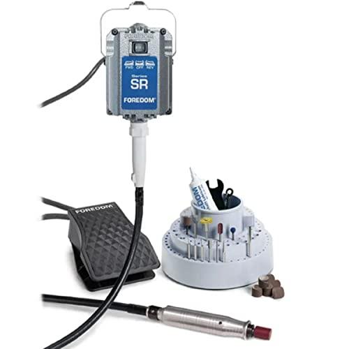 This is among Foredom's Complete Tool Kits that was upgraded with a new, more powerful motor and more comprehensive and versatile rotary accessory selection. Tool Kits contain everything you need to get to work. They take the guesswork out of product selection, offer the best value, and feature smart tool combinations for specific applications. The 5240 Woodcarving Kit has a New Total Retail Value of $457, as a result of adding Fur, Feathers and Fins. The motor and control carry a two year warranty. The kit contains these main components: * All new SR Motor - Foredom's new 1/6 hp, ball bearing, hang-up style motor with speed up to 18,000 rpm. This motor offers substantially more power than any of Foredom's other universal motors - 66% more than Series CC and 33% more than Series S and old SR motors. The All new SR operates in forward and reverse rotation for added versatility. * FCT Control - this foot operated speed control has solid state electronics and comes in a heavy duty plastic housing with an extra wide design. * No. 44T Handpiece. This collet style handpiece is popular among woodcarvers since it accomodates larger accessories with shank diameters up to 1/4". It comes with 3/32", 1/8" and 1/4" collets. The tapered design allows for close and safe work. The No. 44T is a member of the Foredom system of interchangeable handpieces.