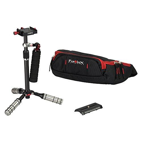 Foodoir Pro Carbon Fiber Gimbal Stabilizer is a handheld camera support featuring a soft grip gimbal handle and three counterweights. It enables you to achieve more stable, shake-free shots when following a subject on foot, climbing up and down stairs, and generally walking or running with your camera. Featuring water-resistant composite construction, it's ideal for GoPros, smaller DSLRs, Mirrorless Cameras (MILCs) and other small to mid-sized cameras weighting up to 2 pounds. The quick release plate has a 1/4"-20 mounting thumbscrew is included and can be positioned along a 3" slot on the camera platform. The camera platform has a rubber surface for secure and scratch-free camera attachment. There are three sets of three stainless steel counterweights which swivel down and lock into place for use, or can be locked in the upright position for storage; the weights measure 1.3oz, 1.7oz and 4.9oz for a grand total of 7.7oz per weight set, 23.2oz (1lb 7.2oz) total adjustable weight. The adjustable center column also makes it easy to balance heavier loads without increasing the weight of the stabilizer, letting you shoot for longer periods of time with less arm fatigue. The gimbal handle becomes easier and easier to maneuver effectively as you get accustomed to it with use.