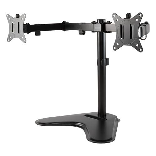 Free up desk space and maximize your ergonomic viewing with the Allsop Freestanding Dual Monitor Arms. A perfect solution for any desk, the freestanding base allows it to be placed virtually anywhere. Unlike clamp-on arm systems, it doesnt require a desk edge for mounting and can be easily moved or adjusted. The full-motion articulating arms allow users to pan, tilt, rotate, and raise monitors to find the perfect ergonomic position. Easy VESA mounting for two monitors up to 32.