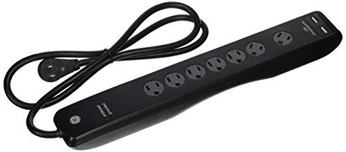 Protect your electronics and charge your portable devices at the same time using the 7-Outlet Advanced Surge Protector with 2 USB Ports from GE. Ideal for smartphones, tablets, eReaders and more, the surge protector features a 2.1A power supply for rapid charging of all your USB devices. Twist-to-lock safety covers cover any unused outlets and there's 1 adapter-spaced outlet to accommodate those bulky power adapters. And the keyhole slots on the surge protector and its slim profile make it easy to mount on a wall behind a flat-screen TV.