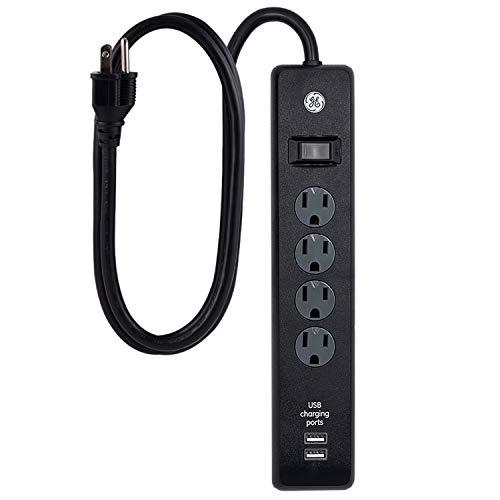 When youre tight on space but need reliable power, trust the GE-branded 4-Outlet, 2-USB Surge Protector. With 4 AC outlets and 2 USB ports (1.0A/5W), this versatile surge protector extension cord allows you to power up your electronics and mobile devices at the same time. Create a centralized powering station for all of your equipment with the 3ft. cord. When it comes to protection, this unit has you covered. The integrated circuit breaker protects your devices against voltage overloads while automatic shutdown technology stops power to your electronics when the surge protection expires. Twist-to-close safety covers keeps your outlets closed when not in use, offering power when you need it and safety when you dont. Backed by a $50,000 connected equipment policy and a limited-lifetime replacement plan, this surge protector is also UL listed to offer you peace of mind that it wont let you down. From the #1 surge protection company, this unit has a protection rating of 450 Joules. When your outlet supply comes up short, the GE-branded 4-Outlet, 2-USB Surge Protector is the solution.