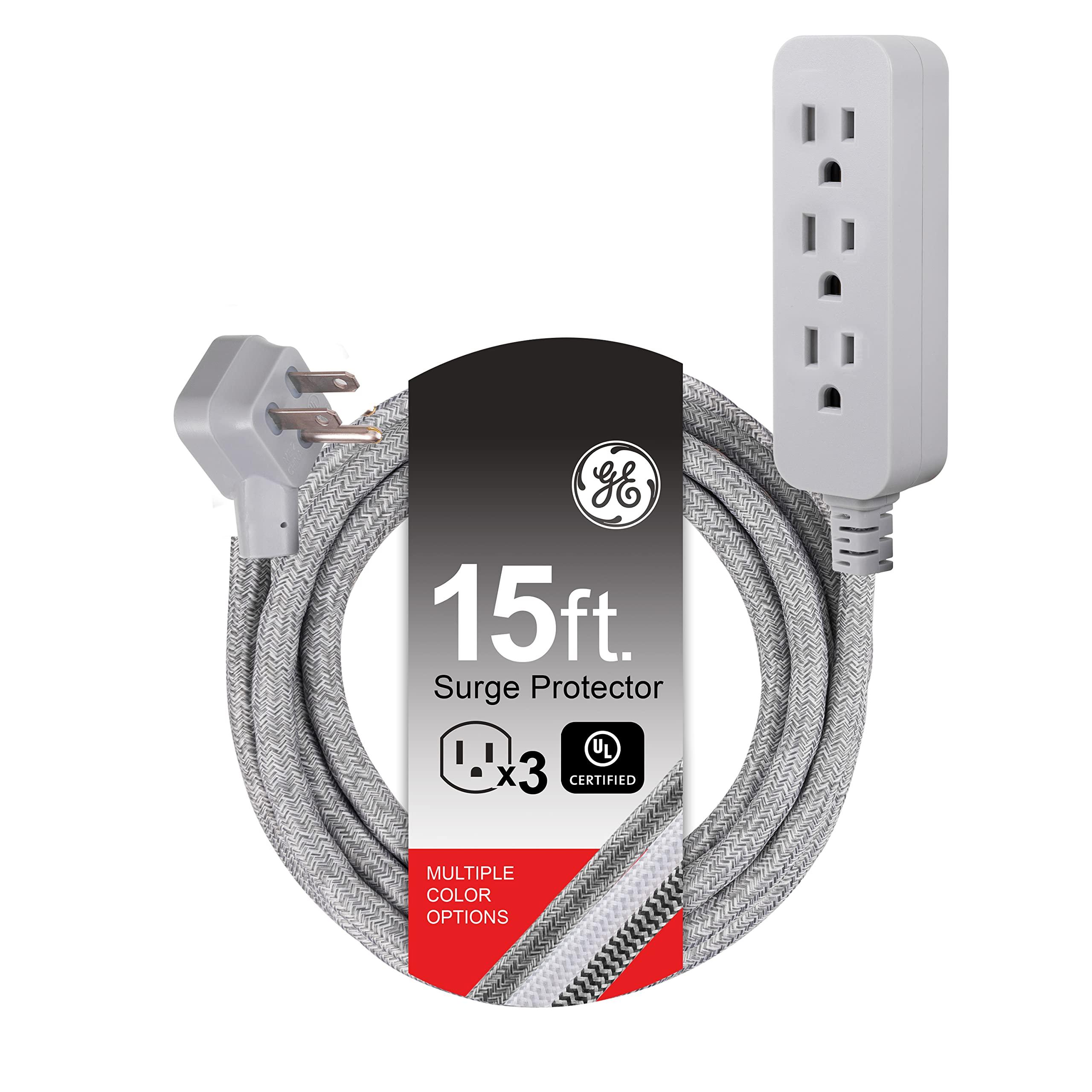 Keep your connected equipment safe and accessible with the GE-branded Extension Cord with Surge Protection. The surge protector includes three grounded AC outlets with 250 Joules of surge protection, transforming your regular three-prong outlet into a safe, organized powering station. Create a permanent place in your home office, entertainment center or workspace to keep all of your electronic equipment accessible. The surge protectors extra-long 15ft. braided power cord is connected to a flat plug, allowing the surge protector to plug in easily behind desks, sofas and other furniture. Featuring a gray heather pattern, the decorative, woven fabric increases the cables durability, is tangle resistant and adds instant style to any space. Get the most from your outlet with a GE branded Extension Cord with Surge Protection.