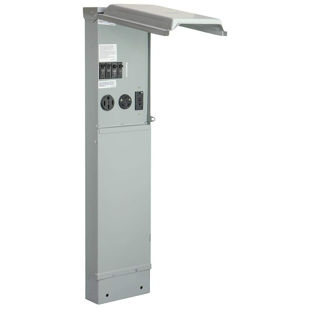 This pad mount RV pedestal is lockable and engineered for maximum protection of receptacles, cords, plugs, breakers. It comes to the construction job site ready to install with no need to assemble individual parts, saving installation time. The dual, heavy-gauge NEMA 3R rainproof enclosures protect against weather, vandalism and nuisance tripping. The unit complies with National Electrical Code and OSHA requirements.