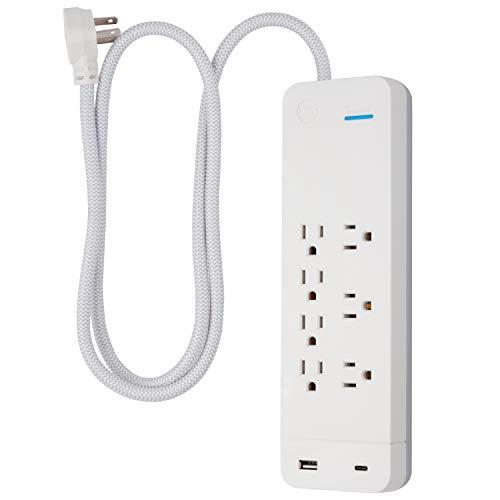 Stay connected and protected with the GE-branded UltraPro 7 Outlet 4ft. Surge Protector with USB Charging. Its sleek design makes it an aesthetically appealing addition to any home or workspace. This includes the unique white and gray combination of the surge protector itself, plus the attractively braided cord that resists tangling. The 1,440-Joule surge-protection capacity helps to ensure that connected equipment stays safe from harmful voltage spikes. For overload protection, the surge protector features an integrated circuit breaker. Additionally, automatic shutdown technology cuts off power to your devices once surge protection expires. And last but not least, built-in USB-A and USB-C ports ensure that laptops, USB-C devices and phones (including the iPhone 15 and iPhone 15 Pro) stay charged and ready for use. For a premium design that offers equal parts fashion and function, make a connection with the GE-branded UltraPro 7 Outlet 4ft. Surge Protector with USB Charging.