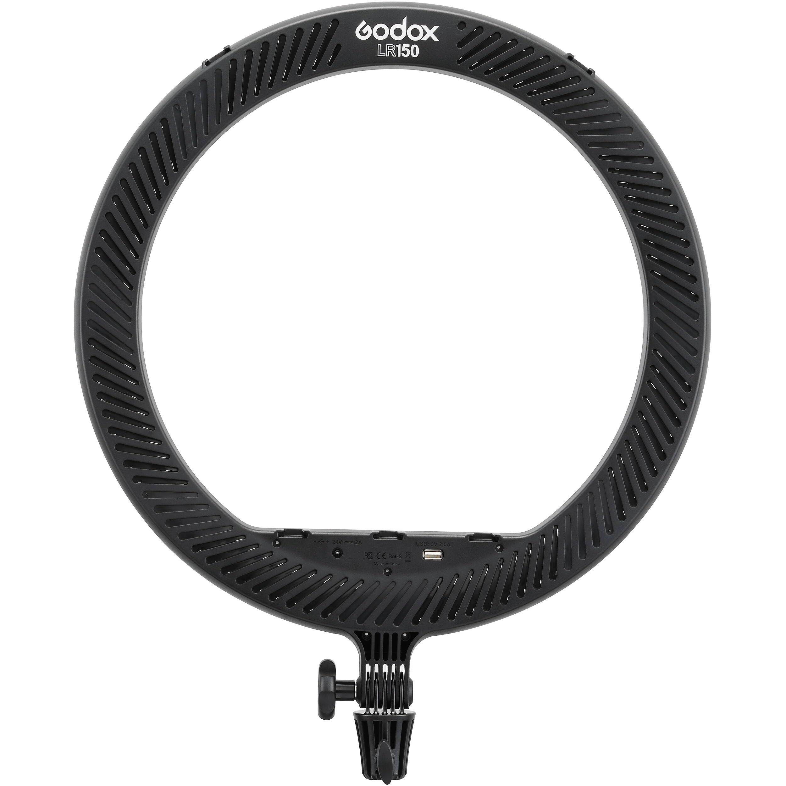 This LR150 Bi-Color LED Ring Light in black from Godox has a distinctive shape and variable color temperature from 3000-6000K to match other fixtures, ambient light conditions, or just for creative expression. Designed with holes on the back for great heat dissipation. 180 rotation angle, allowing you to find the perfect light angle. The Godox LR150 has a USB port to charge to smartphones.