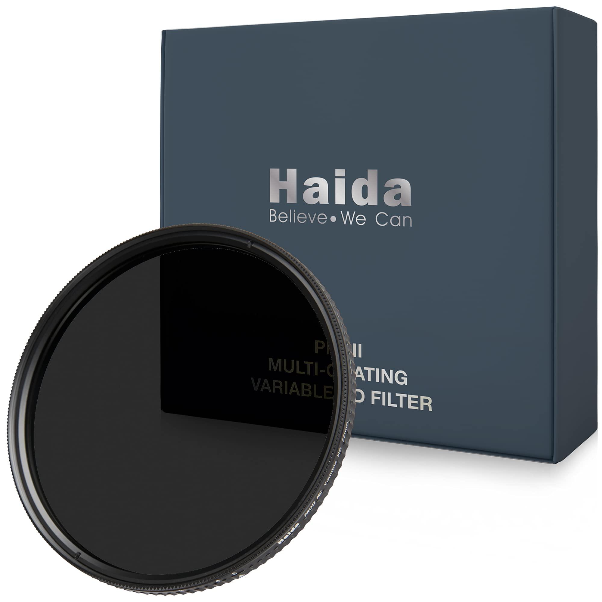 The Haida PROII Variable ND 2-5 Stop is a solid variable neutral density filter that provides an exposure reduction of 2 to 5 stops. The 0.6 to 1.5 density creates a darkening of the entire image, allowing you to video or photograph with a wider aperture or slower shutter speed than normally required. The degree of density is easily controlled by rotating the front filter ring, helping you to predetermine the additional exposure length required. By slowing your exposure time or increasing your aperture, you can control depth of field and convey movement more easily. For easier, repeatable control over density settings, the front ring is also visually demarcated with dots that represent different density values. Key features of the Haida PROII Variable ND 2-5 Stop Reduces Exposure by 2 to 5 Stops Darkens Entire Image Greater Control over Exposure Settings Optical Glass Construction Coating: Optical reduce reflective coating, Optical hydrophobic hard coating