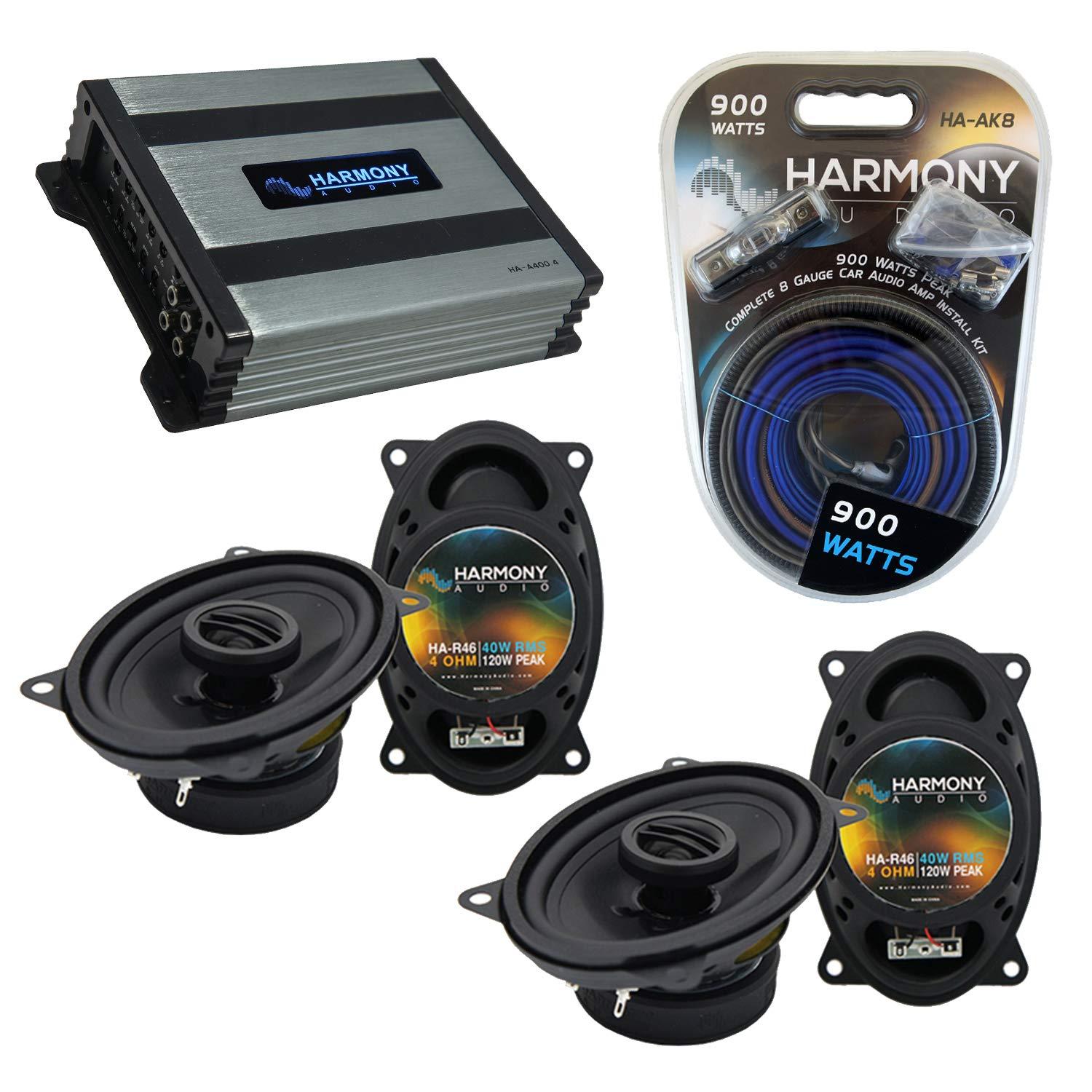 This Package Includes the Following Items: 1 x Harmony Audio HA-A400.4 Car Stereo Alloy Amp 4 Channel 800W Fulll Range Speaker or Sub Amplifier 1 x Harmony Audio HA-AK8 Car Stereo Complete 8 Gauge 900W Amp Amplifier Install Kit - Nickel 2 x Harmony Audio HA-R46 Car Stereo Rhythm Series 4x6" Replacement 120W Speakers