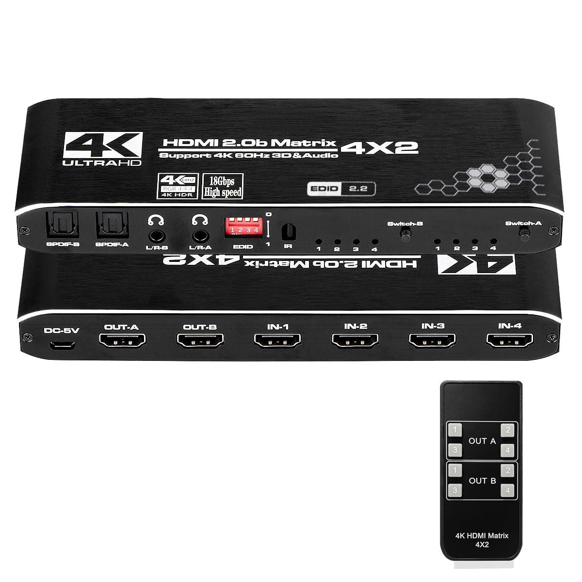 - HDMI Matrix 4x2: It can connect four 4K HDMI signal sources to two HD display or monitor, and it can also extract the HDMI input Audio signal with Toslink SPDIF optical fiber or 3.5mm stereo headphone output. It supports HDCP 2.2, HDMI2.0b, 4K@60HZ, RGB4:4:4, 4K HDR. For the EDID setting, it will for Output A. So when you two display needs to be EDID setting, Please set at Right EDID Mode that both Display will shows right. After you had set the EDID, Please restart your HDMI Matrix Switch.