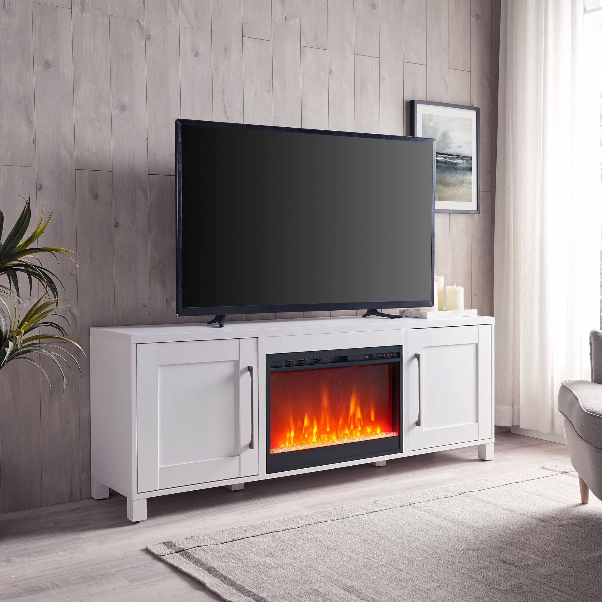 - Features an electric fireplace with LED faux-flames, with 4 shelves and 2 enclosed doors for ample storage.