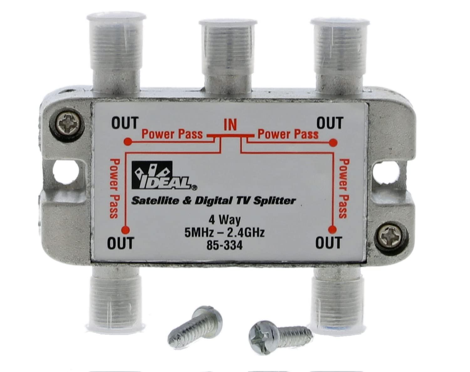 High performance 2.4 GHz Digital Splitters are used for splitting a single coax line into four lines. These splitters are designed for applications that operate in the 5 MHz to 2.4 GHz range, which include Satellite, Digital/HD Cable TV, Broadcast (over the air) TV, CCTV and other general-purpose coaxial cable splitting requirements. Splitters support the 1 GHz to 2.4 GHz frequency range for satellite and on-demand cable television services. All ports on the 2.4 GHz splitters are power pass enabled. This allows any of the ports to be used to pass power from the satellite set top box to the satellite dish or multi-switch. All splitters include an internal printed circuit board design inside of a nickel plated zinc die cast housing which helps to improve overall splitter performance in return loss, insertion loss and port-to-port isolation measurements, resulting in a stronger, cleaner signal with more protection from outside signal interference. All 2.4 GHz splitters have a solid, sealed body for improved EMI/RFI performance. Machine formed threads on the F ports allow for smooth connector mating.