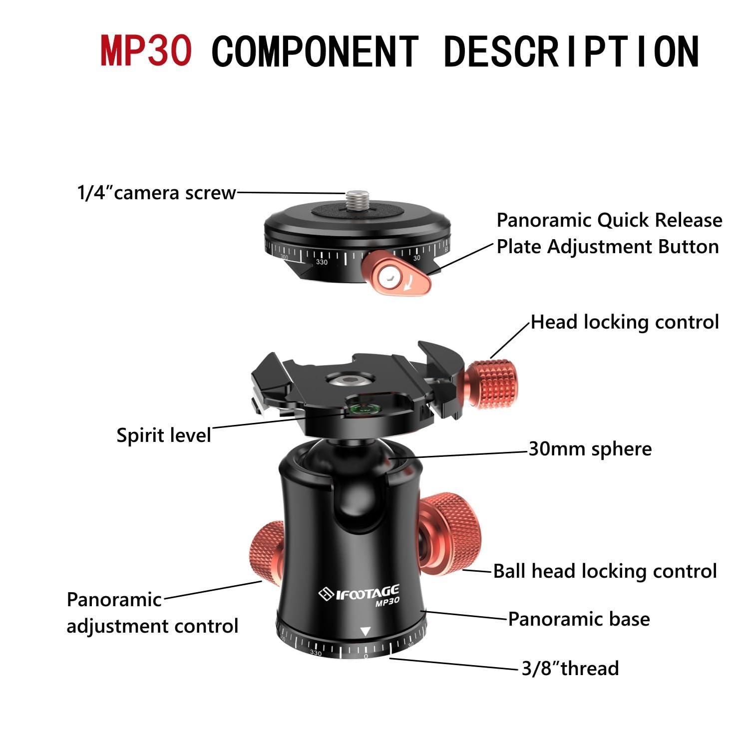 - 360rotation The base has a scale panorama chassis, which can accurately find the position. The M30 spherical head can be adjusted by the knob to achieve 360panoramic shooting, and the pitch angle can be freely selected.Additionally, the ball head is equipped with a removable panoramic quick-release plate, allowing you to seamlessly switch between cameras, smartphones, and other accessories.