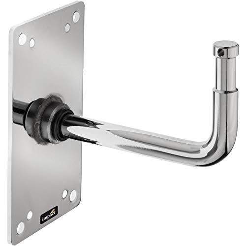 Constructed of chrome-plated steel, this Impact Wall Plate with 90-Degree Baby Pin is a staple on any type of production set. The base can be mounted to any flat surface via its 8 anchor points and optional screws. The pin measures 5" from the base to the 90-degree bend, and 3" from the bend to the 5/8" diameter industry-standard stud. This allows full tilting range for larger lights, or for use as a hook, for rigging or other items. The wall plate has a hole in the pin for a safety cable.