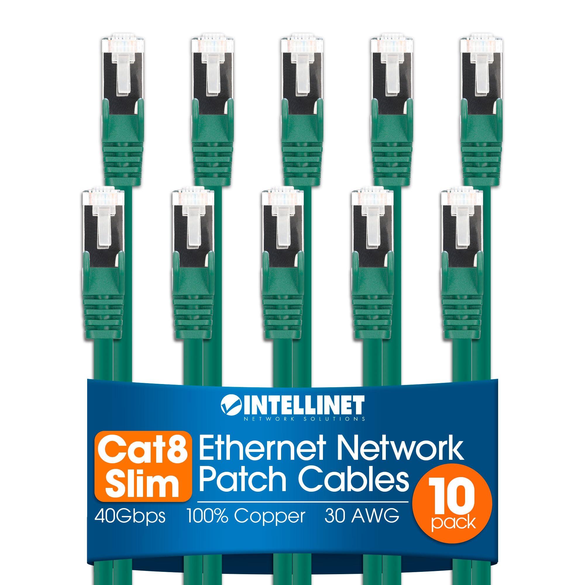 Intellinet Slim Cat8 Ethernet Network Patch Cable 10-Pack - 40Gbps & 2000MHz, Snagless Boot, 30AWG Pure Bare Copper Wire, Gold-Plated Contacts, Lifetime Mfg Warranty 14ft, 10 Pack, Green