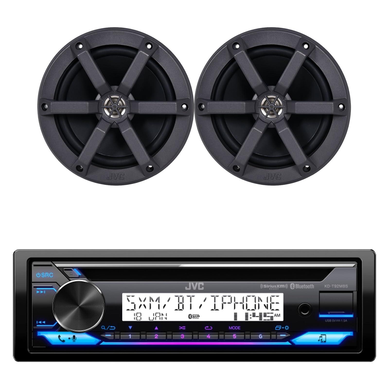 - PACKAGE BUNDLE INCLUDES: JVC KD-T92MBS Single DIN Marine MotorSports USB Bluetooth AM/FM Stereo CD Player Receiver with 2x JVC CS-MS620 6.5" 100 Watt Max Power 2-Way Boat Audio Speakers