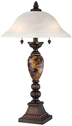 A modern classic with an antique look, this 2-light table lamp will take your home decor to a new level. The translucent, carved white alabaster glass bowl shade has beautiful veins of solid white running through it. The base features decorative carving and a stunning marbleized font in rich golden browns. Two pull cords operate each of the two individual lights.