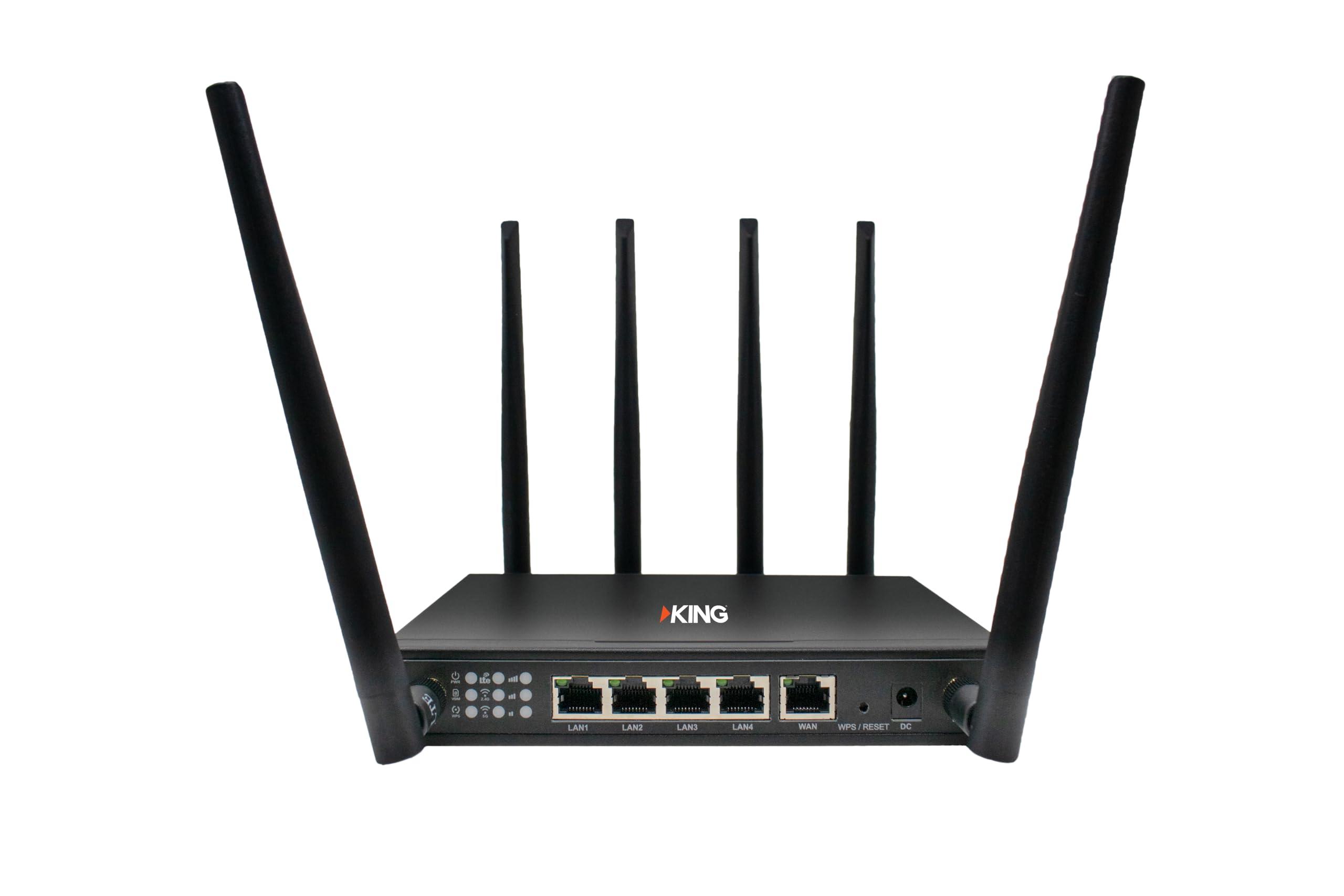 The KING Passport is a compact and versatile networking router, perfect for RVing and traveling. Its dual-band frequency and high-gain MIMO antennas enable fast data transfer rates of up to 300 Mbps and support for 32 devices. The router is equipped with an expandable physical SIM slot, allowing for enhanced versatility and compatibility with various network providers. It features four RJ45 10M/100M/1000M LAN Ethernet ports and one RJ45 10M/100M/1000M WAN Ethernet port, providing flexible connectivity options. The Passport has a sleek black metal design, measuring 180 x 130 x 30mm and weighing less than 1,500g, making it easy to carry. The device can be powered through any standard A/C outlet and consumes a maximum of 7W in ON state and 0.5W in OFF state. The Passport also includes various LED indicators for power, VSIM, LTE, Wi-Fi, SIM, signal, and WAN/LAN status.
