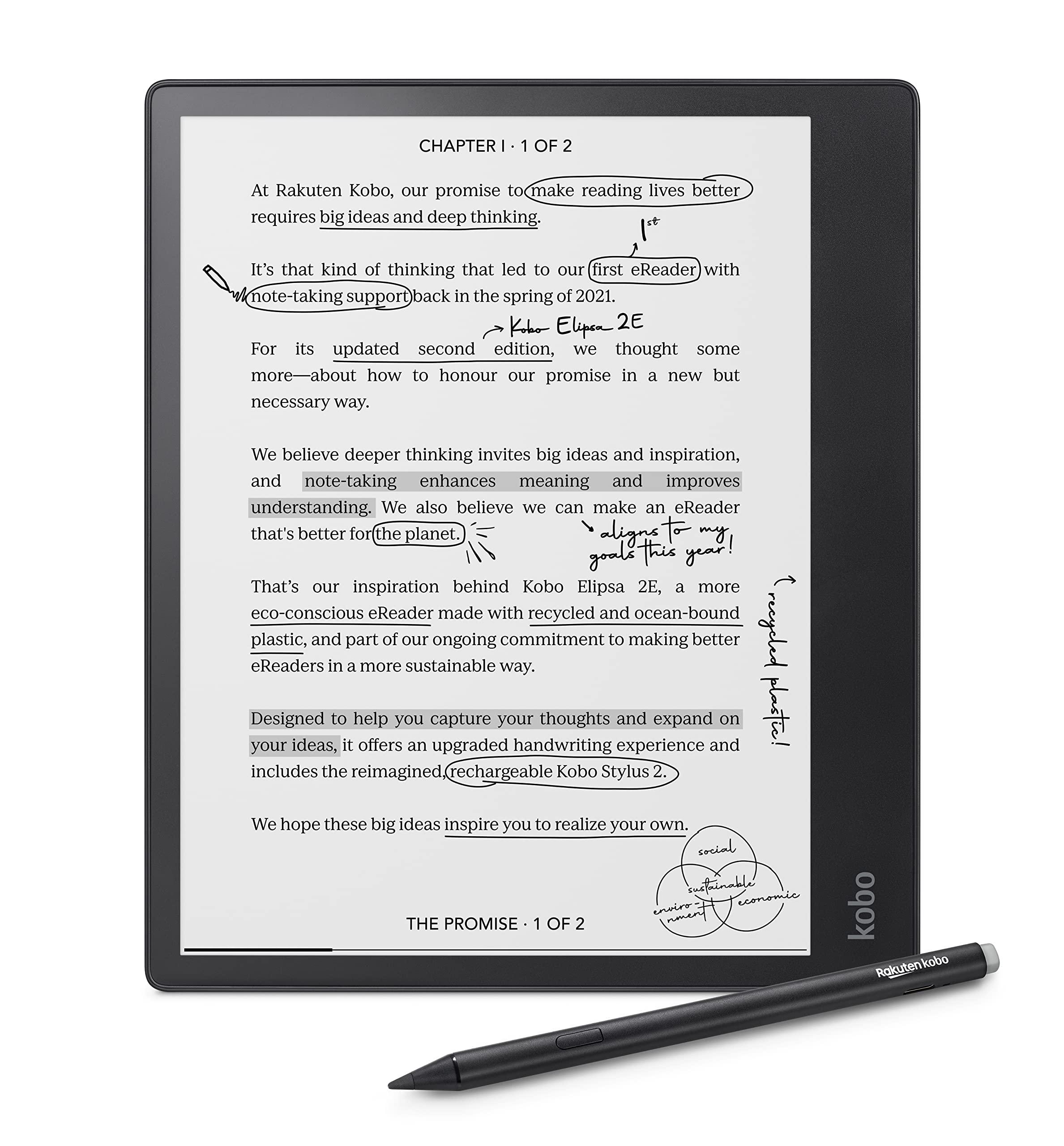 - . . . Made for big thinkers and bundled with Kobo Stylus 2, the new upgraded Kobo Elipsa 2E is designed to help you focus and organize your thoughts. With an exterior made of recycled plastic and ocean-bound plastic, the eco-conscious Kobo Elipsa 2E eReader is designed to capture all your big thinking. An excellent choice for anyone who loves to read and wants a lightweight eBook reader thats easy to use and take with them on the go!
