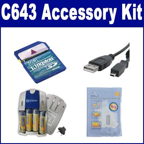 Kodak C643 Digital Camera Accessory Kit includes the following items: 1) U-8 USB Cable for Kodak Easyshare 2) 2GB Standard Secure Digital (SD) Memory Card 3) 5 Piece Digital Camera/Camcorder Deluxe Cleaning Kit 4) AA and AAA NiMH Quick Battery Charger - Includes 4-pack of 2800mAh Rechargeable AA Ni-MH Batteries - 110/220V