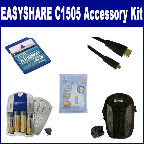 Kodak EASYSHARE C1505 Digital Camera Accessory Kit includes the following items: 1) AA and AAA NiMH Quick Battery Charger - Includes 4-pack of 2800mAh Rechargeable AA Ni-MH Batteries - 110/220V 2) 2GB Standard Secure Digital (SD) Memory Card 3) SDC-21 Small Point & Shoot Digital Camera Case, Black / Grey 4) 5 Foot High Definition Micro HDMI (Type D) To HDMI (Type A) Cable 5) 5 Piece Digital Camera/Camcorder Deluxe Cleaning Kit