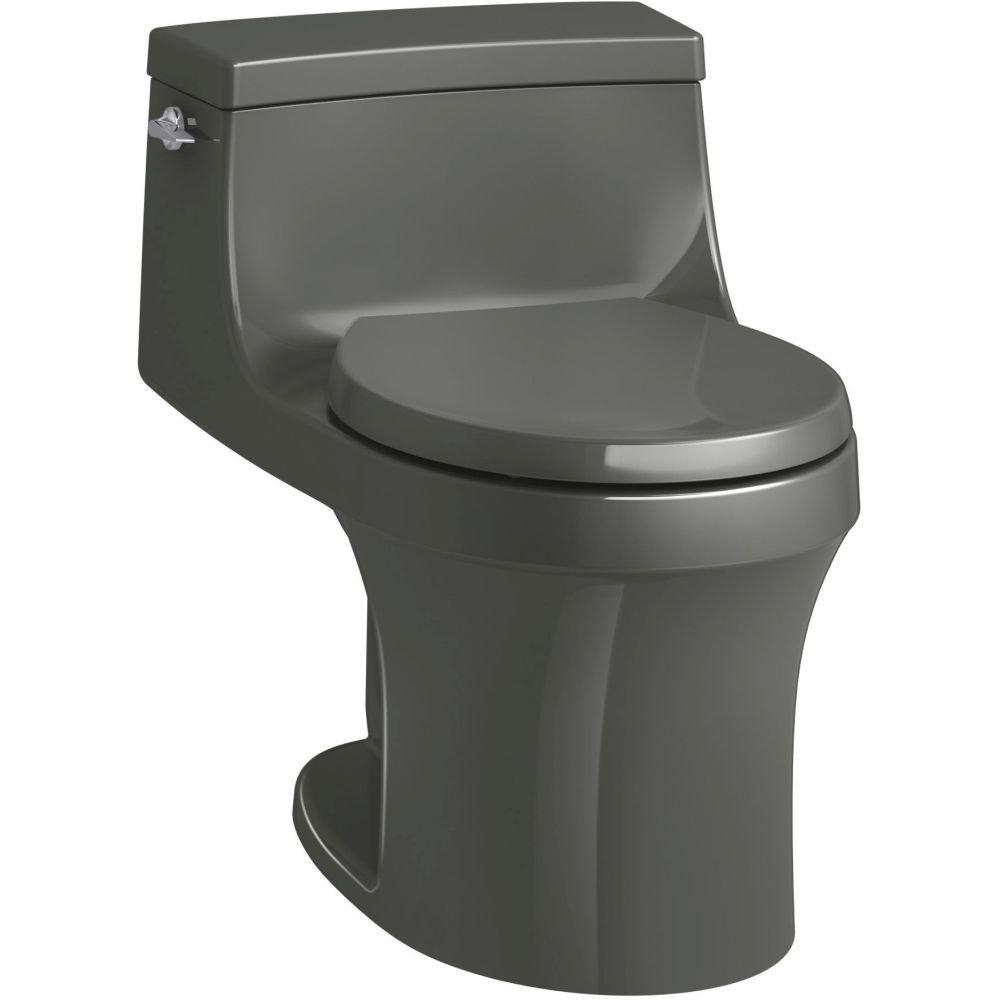 With sleek curves and a low-profile silhouette, the San Souci one-piece toilet makes a strong design statement. A compact tank curves seamlessly into a round-front bowl for a space-saving profile. A 1. 28-gallon flush provides significant water savings of up to 16, 500 gallons per year, compared to a 3. 5-gallon toilet, without sacrificing performance. This toilet comes with a Grip-Tight Q3 seat featuring innovative technology that prevents the seat from slamming and simplifies both cleaning and installation