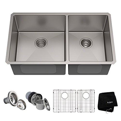 Add Please note, Garbage Disposal Flange and Stopper Kit must be purchased separately. Kraus Stainless Steel Kitchen sink comes with: Set of stainless steel bottom grids with protective feet and bumpers. Stainless steel basket strainer. Stainless steel strainer. Dish towel. Mounting and installation brackets, cutout template are included. 32.75-Inch L x 19-Inch W x 10-Inch H (overall sizes). 16.9-Inch L x 17-Inch W x 10-Inch H (bowl sizes). 12.9-Inch L x 17-Inch W x 10-Inch H (bowl sizes). Fits 33-Inch cabinet. Certified and Listed by UPC, cUPC, CSA, IAPMO, ANSI and SCCManufactured by Kraus. Limited Lifetime Warranty.