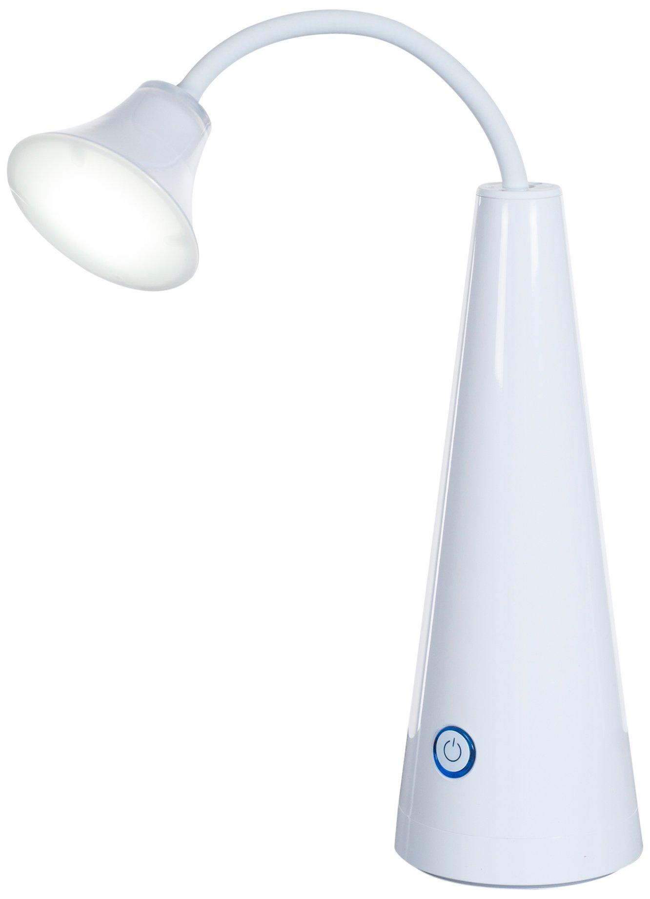 This simple yet modern desk lamp will bring style and function to your work space. The bendable goose neck and 4 brightness settings make it easy to have the amount of light you need, exactly where you need it. Retract the goose neck into the base and use the lamp as a lantern. The futuristic, cone design adds a fun and unique touch. Super Bright LED Desk Lamp Bendable and Retractable Goose Neck Touch On/Off Button 4 Brightness Settings Main Light: 9 LED Bulbs Lantern Light: 4 LED Bulbs 7 Watt 73 inch Power Cord with 110V Wall Adaptor Input: DC IN 10V Dimensions: Height: 14 inches Base Diameter: 4.25 inches Light Diameter: 3.5 inches Goose Neck Length: 8 inches