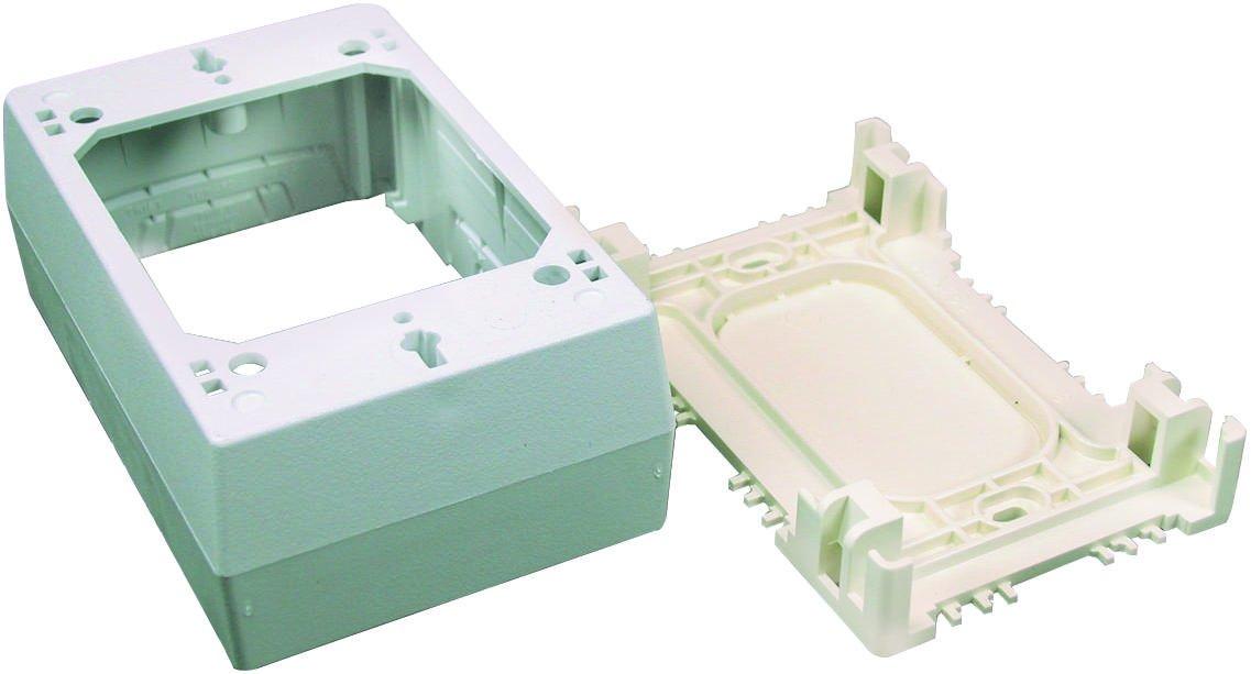 Ivory plastic starter/outlet box (1"deep). fits over existing single-gang outlet to feed power as the starting point for your system (1"deep).. finish: ivory. Material: plastic.