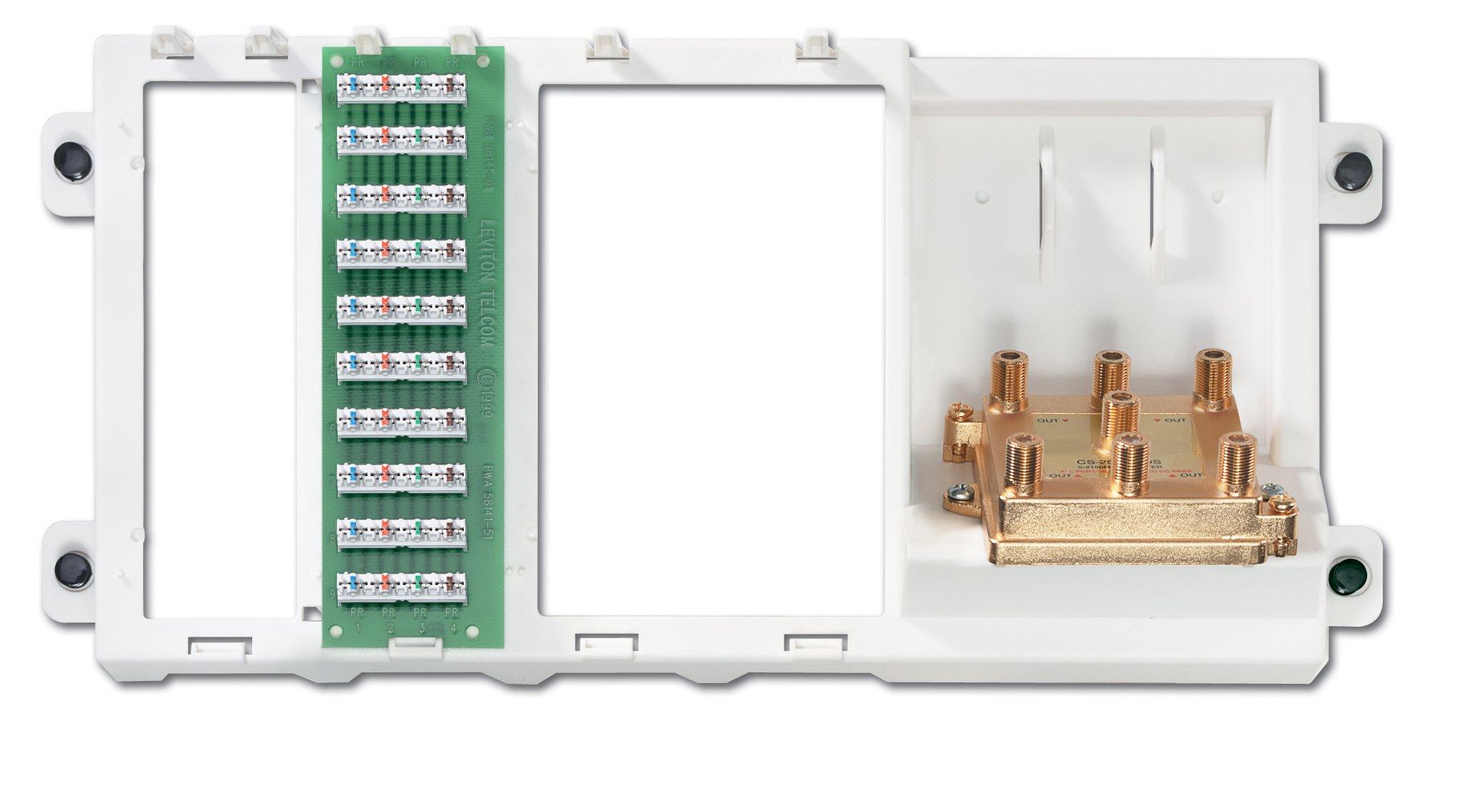 110 IDC TYPE; 13.3 INCH W X 2.28 INCH D X 6.13 INCH H SIZE; UL (CANADA AND US), FCC APPROVAL; BRACKET MOUNTING; STRUCTURED MEDIA[R] BRAND; BRACKET MATERIAL WHITE ABS PLASTIC; INCLUDES (1) 1 X 9 BRIDGED TELEPHONE BOARD, (1) 6-WAY 2 GHZ TV SPLITTER