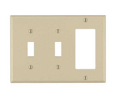 Leviton Combination Wallplates come in a variety of configurations and gangs, and are available in a broad selection of materials including, aluminum, brass, stainless steel and plastic, and in an assortment of colors. If you have a unique application, Leviton can also customize a wallplate for a specific job. 3-Gang 2-Toggle 1-Decora/GFCI Device Combination Wallplate, Standard Size, Thermoset, Device Mount, Ivory. Decora is a registered trademark of Leviton Mfg. Co., Inc.