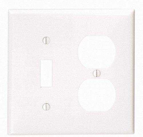 Leviton Combination Wallplates come in a variety of configurations and gangs, and are available in a broad selection of materials including, aluminum, brass, stainless steel and plastic, and in an assortment of colors. If you have a unique application, Leviton can also customize a wallplate for a specific job. 2-Gang 1-Toggle 1-Duplex Device Combination Wallplate, Standard Size, Thermoplastic Nylon, Device Mount, White.