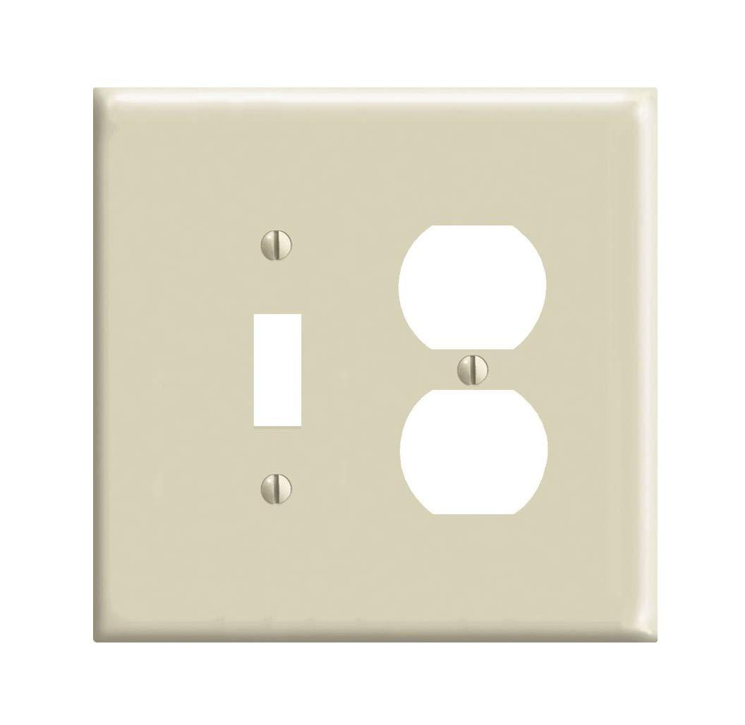 Highlights: Color : Ivory Material : Nylon Size : 4-15/16" W x 4-7/8" H Number of gangs : 2 gang Wall plate style : Duplex/Toggle Shape : Rectangle Number of switch openings : 1 Number of outlet openings : 2 Smooth face and rounded edges resist dust accumulation Impact, abrasion, fade and discoloration resistant Device mount