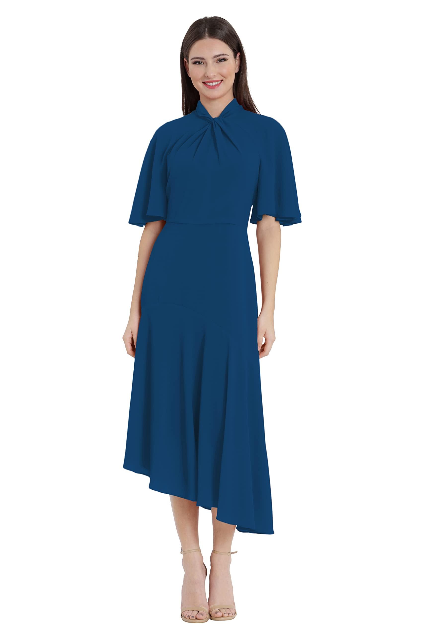 - Mock neck with front twist detail, creating shirring at top bodice, elbow length flutter sleeves, waist seam, and a midi length diagonal hem skirt with a drop waist diagonal seam detail.