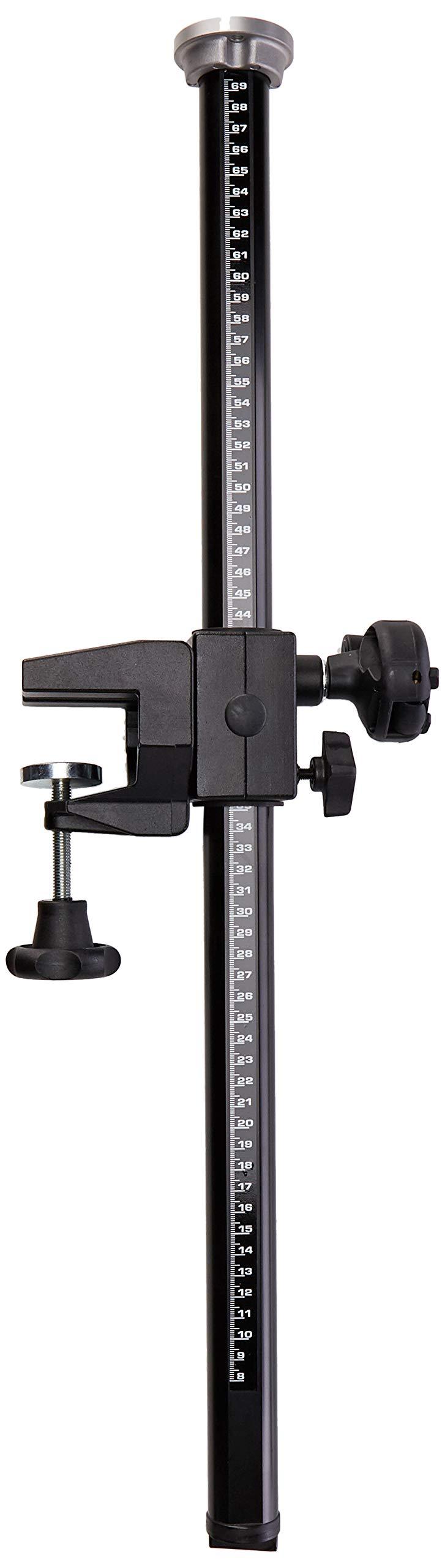 This geared column has a clamp that will fit a thickness of 18- 38mm. This allows you to attach a head and your camera to a table for small product work. Adjustable between 5cm and 66cm. Head not included. Attachment: 3/8'' screw; geared column. clamp range - max (rectangular tube): 0.71 in.; clamp range - min (rectangular tube): 1.50 in.; color: black; material: aluminum; maximum height: 25.98 in.; minimum height: 1.97 in.