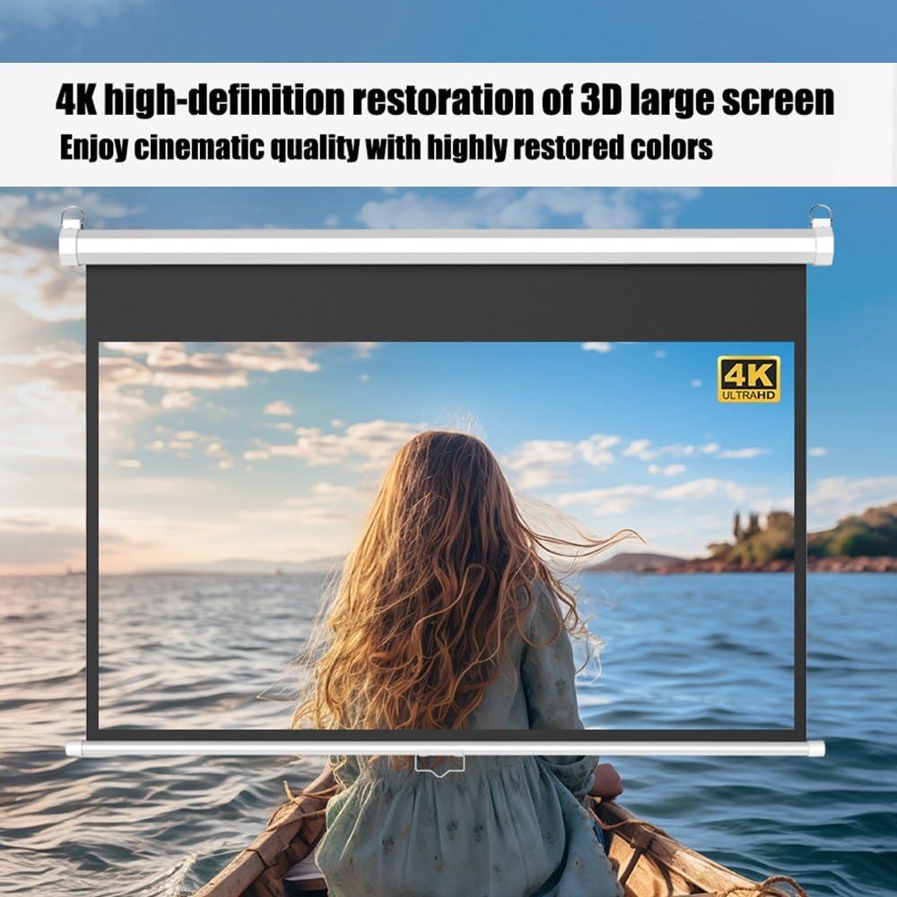 Projection Screen, Projector Screen, Projector Movie ScreenHD projection screen, wall-mounted design, easy to carry, support 3D 4K projection quality, high definition imaging, from office meeting to home theater, from school to business center, the projection screen is suitable for a variety of indoor and outdoor scenes, to meet your various needs, bring you and your family and friends shocking resolution and realistic color.Product Name: Projection ScreenMaterial: White FiberglassSize options: 60 inchRatio: 4:3/16:9Gain: 2.5Viewing angle: 160degreeInstallation: ceiling/hanging installationPackage included:1 x Projector ScreenNote:Light shooting and different displays may cause the color of the item in the picture a little different from the real thing.This product is measured manually, please allow an error of 1-3 cm, thank you for your understanding.