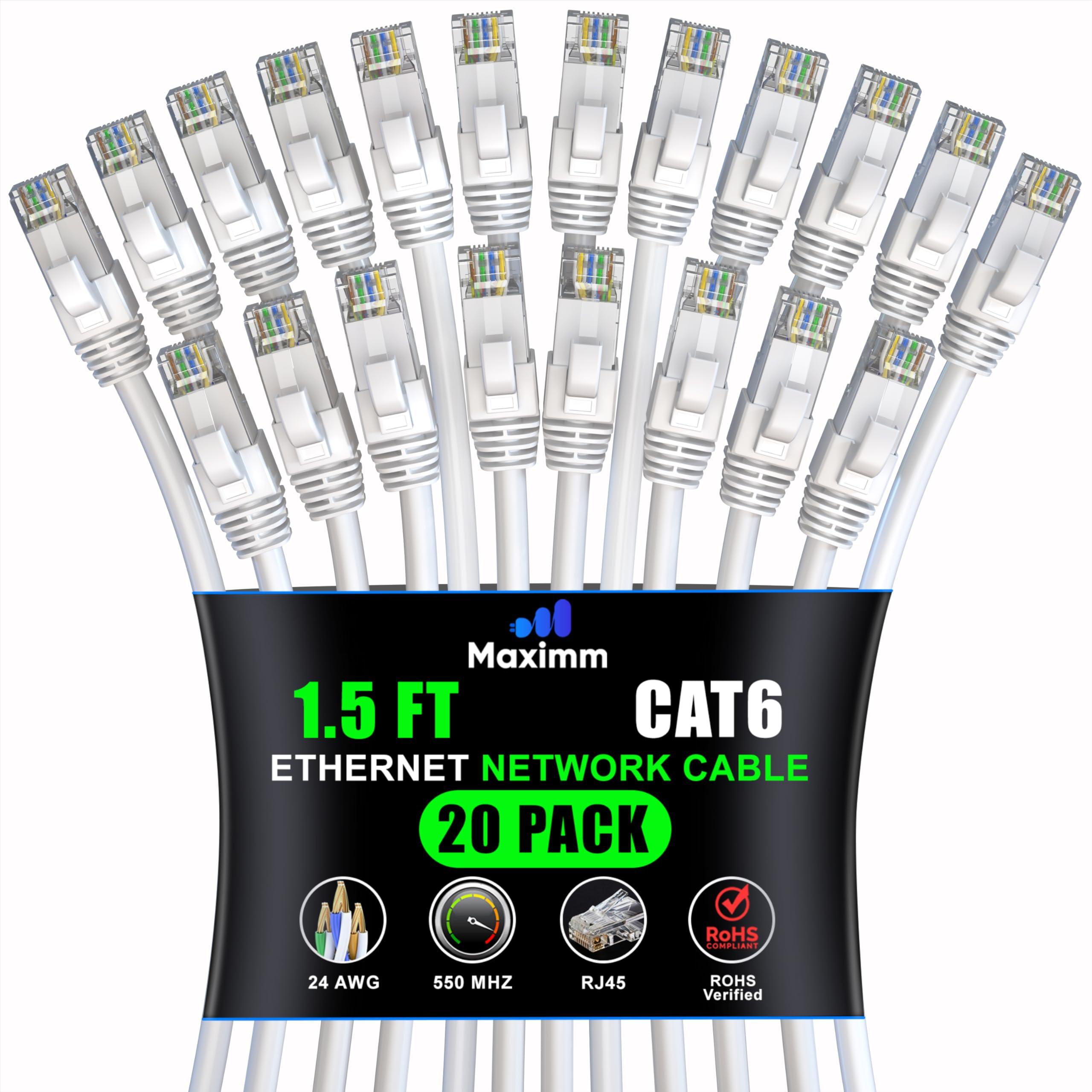 Maximm Cat 6 Ethernet Cable 1.5 ft (20-Pack) - High-Speed LAN Cable, Internet Cable, Patch Cable, and Network Cable - UTP, 10Gbps, 550MHz Ethernet Cord - White