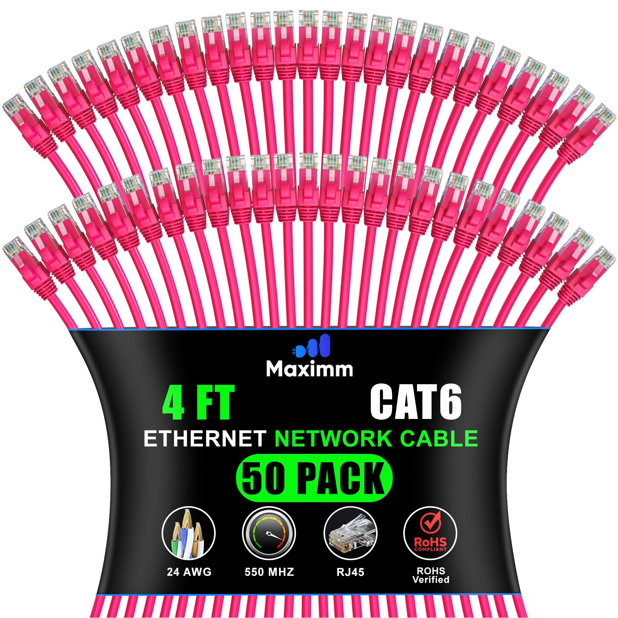Maximm Cat 6 Ethernet Cable 4 Ft (50-Pack) - High-Speed LAN, Internet, Patch, and Network Cord - UTP, 10Gbps, 550MHz - Pink