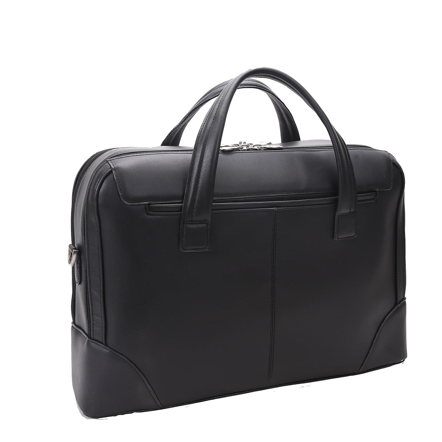 Structured Leather briefcase with dual handle. Easy access front pocket and back slip pocket. Fully-lined interior with leather trim and silver accent hardware. Front compartment features two pockets and secure zipper pocket. Back compartment features Built-in laptop protection and tablet pocket with organizer for business cards, pens, and accessories. Leather smart strap for piggy-backing onto rolling cases. Removable and adjustable nylon strap with leather shoulder pad.