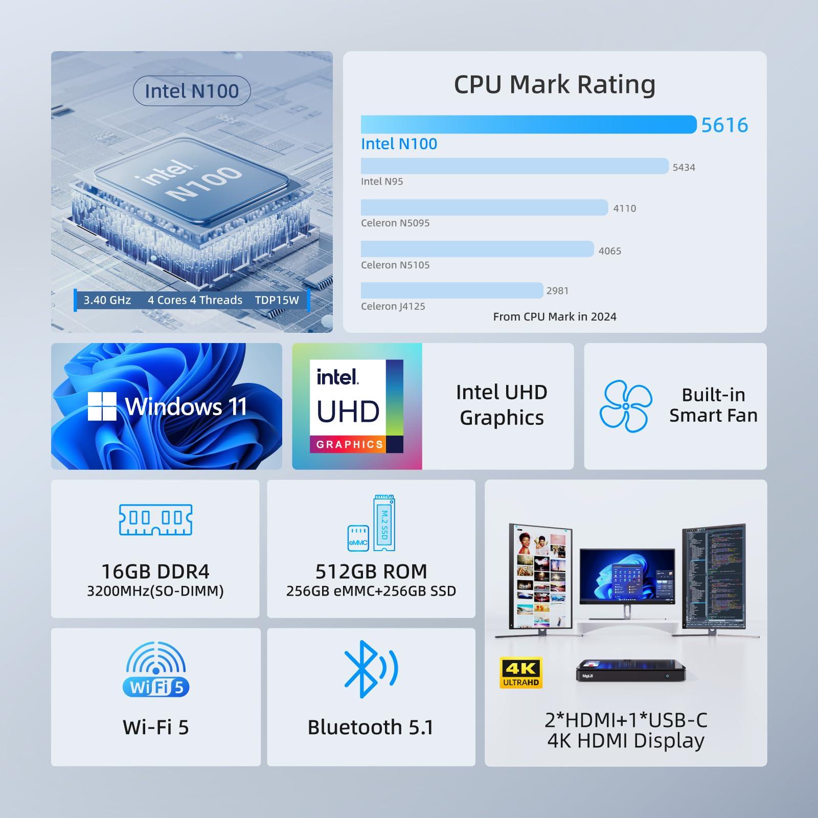 - Powerful 12th Alder Lake N100 -- MeLE Overclock 4C micro pc powered by latest 12th Gen Alder Lake N100 processor (up to 3.4GHz) 4C/4T, 6Mb Smart Cache, 15W TDP, N100 mini pc delivers more than 35% higher performance than N5105/N5095 CPU. Support 7/24 stable running and responsive performance. Supply you with higher efficient on work, education.
