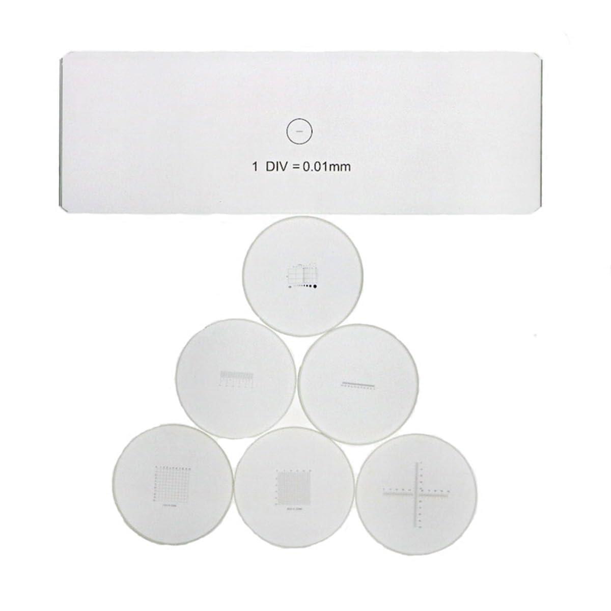 - Set of 7 microscope micrometers, including one stage calibration slide with 0.01mm line resolution, and 6 eyepiece graticules.