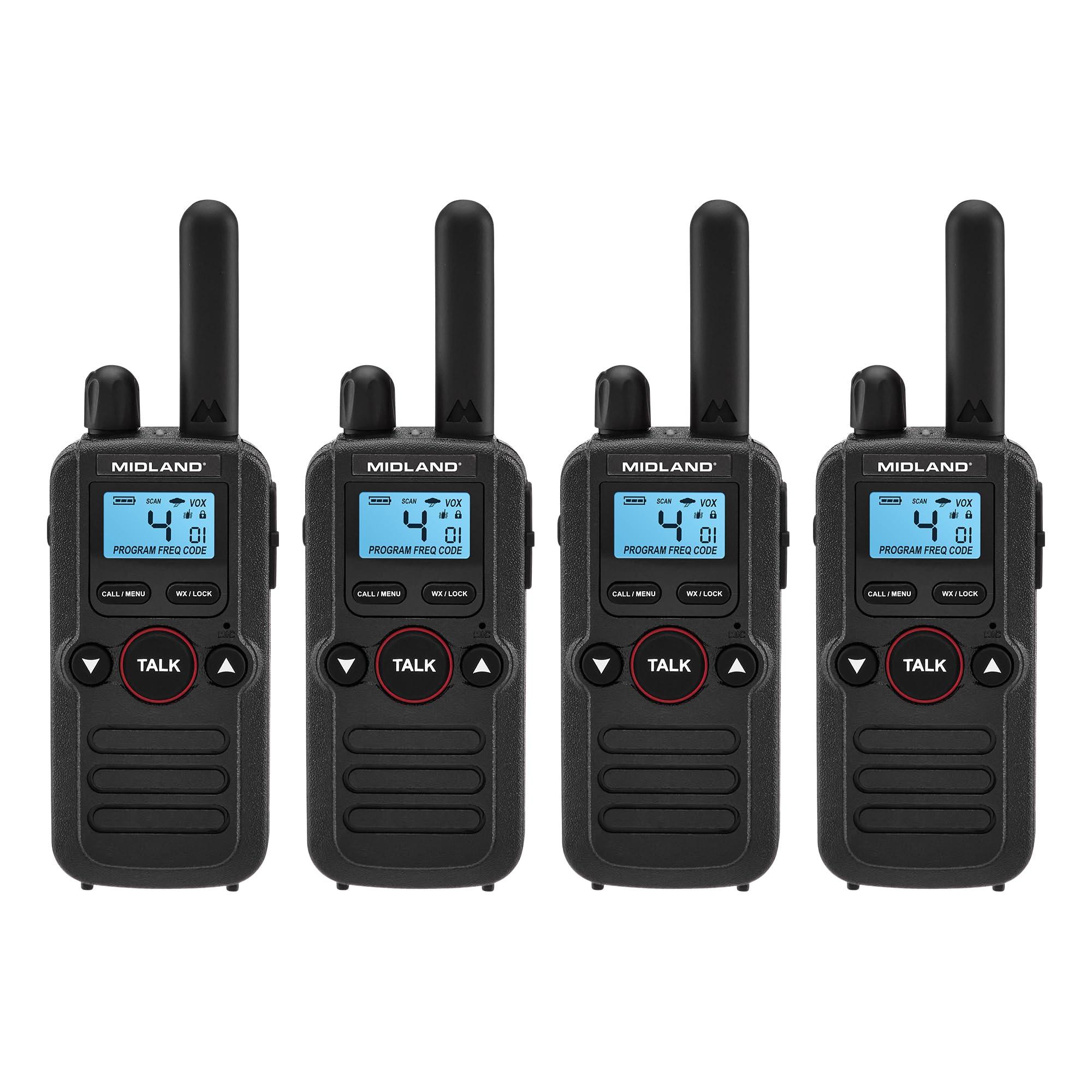 This bundle Includes 4 Midland BR180 radios, four lithium-ion battery packs, four ear wrap headsets, four holsters with swivel belt clips, four dual slot desktop chargers, four AC adapters, four wrist lanyards, four owner's manuals and a two year manufacturer warranty.