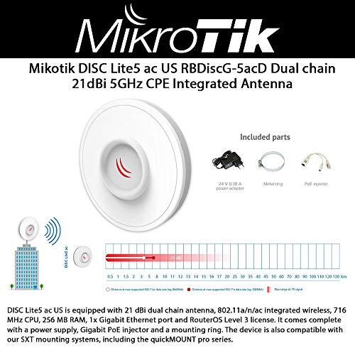 - DISC Lite5 ac is equipped with 21 dBi dual chain antenna, 802.11a/n/ac integrated wireless, 716 MHz CPU, 256 MB RAM, 1x Gigabit Ethernet port and RouterOS Level 3 license.