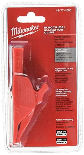 (1) Black industrial alligator clip, (1) red industrial alligator clip Features: Universal alligator clips attach to all connecting test leads; UL approved for improved safety; Jaws open to 40mm wide; Constructed with rugged rubber over molding; 2 year warranty Specifications: Maximum voltage 1000V; Maximum current 10A; Length 2.5"; Safety category rating CAT IV 600V / CAT III 1000V; Jaw size 40mm Milwaukee's Industrial Test Probes attach to 49-77-1003 industrial connecting test leads Designed to withstand up to 1000 volts and 10 amps, this set of alligator clips used along with 49-77-1003 Industrial Test Leads and 49-77-1004 Industrial Test Probes are ideal for measuring voltage, current and resistance of most electrical systems Covered by 2 year warranty.
